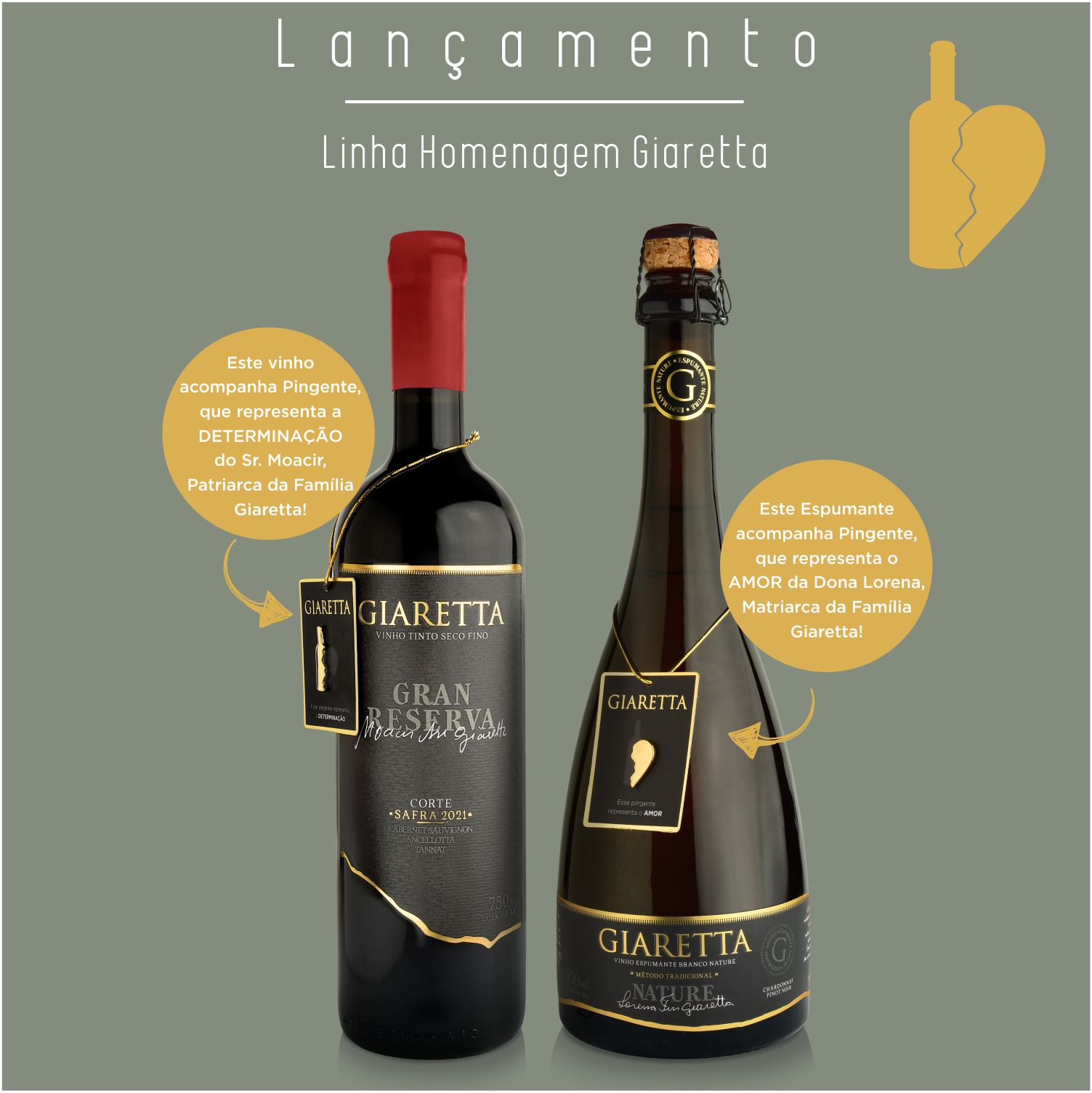 A Linha Homenagem GIARETTA traz consigo dois fatores muito importantes, o reconhecimento e a gratidão. Como todas famílias tradicionais de origem italiana, o patriarca e a matriarca representam a base, o alicerce, e são símbolo de força, de trabalho incansável na busca do sustento de seus filhos e netos. Assim acontece com a Família Giaretta, o Seu Moacir Ari Giaretta e Dona Lorena Fin Giaretta são incansáveis chefes de família, e o fruto dessa vida de muito labor resultou na Vinícola Giaretta, que agora, com muito merecimento, os homenageia, reconhecendo e agradecendo toda dedicação, amor e persistência.