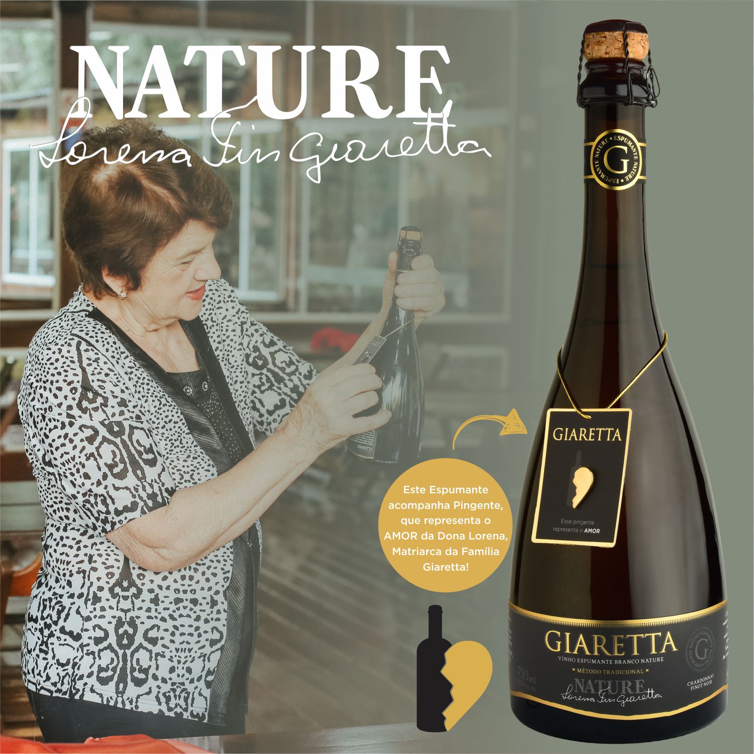 O Espumante Nature Champenoise Giaretta traz consigo o resultado da seleção criteriosa de uvas Chardonnay e Pinot Noir e da evolução por dezoito meses de autólise na garrafa. O cuidado e amor dado à elaboração desse Espumante é fruto do aprendizado transmitido pela Dona Lorena, matriarca da Família Giaretta. De aspecto límpido e brilhante, sua perlage fina desvenda notas florais e sutis notas cítricas de frutas tropicais, com cremosidade evidente e boa persistência gustativa.
